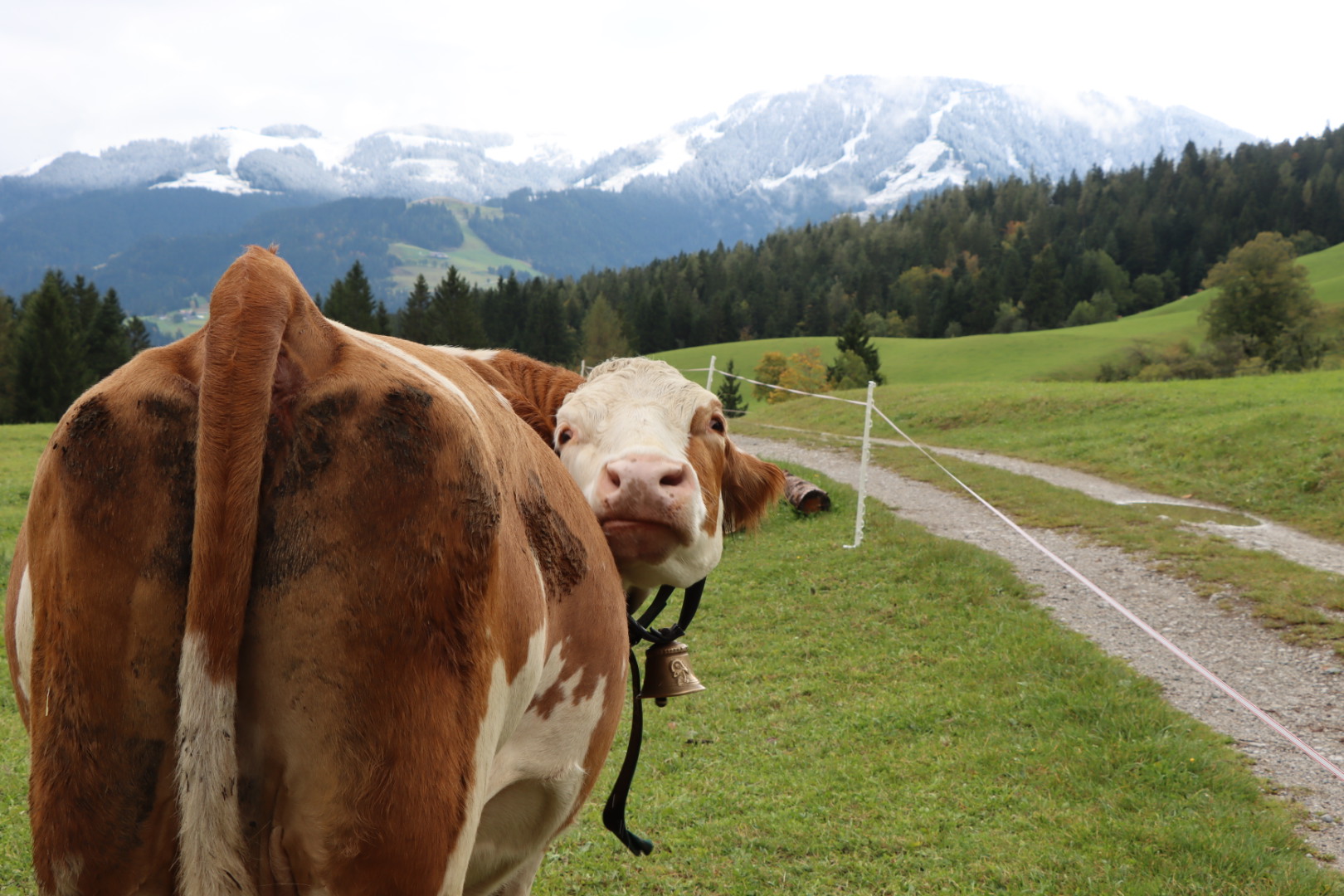 Nun ging es auf dem anderen Weg runter ins Tal. Der Weg ist ziemlich steil. Wie da der Bergdoktor mit seinem alten Mercedes 200 raufkommt, ist mir ein Rätsel. Oder ist das alles nur Fake und die Serie baut auf Klischees? Fragen über Fragen. Aber wenigstens ging es runter besser und schneller als rauf. Und so kamen wir dann überraschend schnell zur Talstation und dem Parkplatz. Michaela hatte noch ein Fotoshooting mit ihrer Lieblingskuh.